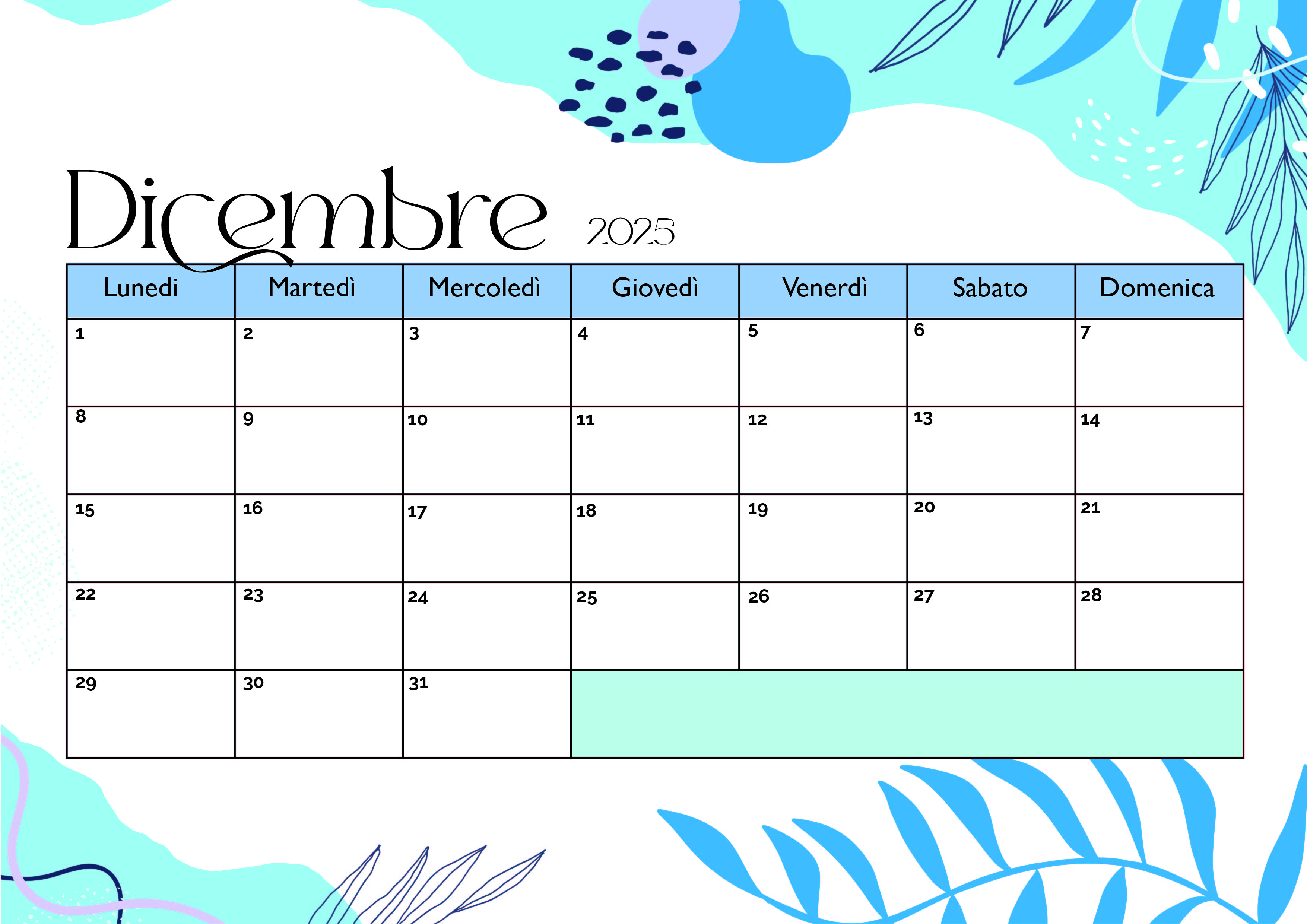 In Globalendar, non offriamo solo calendari di tutti i mesi dell’anno 2024, ma siamo anche pronti per il 2025. Qui, hai l’opportunità di stampare o scaricare il tuo calendario di Dicembre 2025 in formati versatili come il PDF, facilitandone l’uso in casa o in ufficio. Potrai annotare riunioni, eventi, date importanti e tutto ciò di cui hai bisogno per mantenere la tua organizzazione aggiornata, avendo la sicurezza di poterlo consultare sempre quando ne hai bisogno.